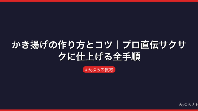 天ぷらの食材 かき揚げの作り方|バラけない5つのコツと黄金比率を徹底解説 かき揚げがバラバラになる原因は衣の配合にあります。プロ直伝の黄金比率と5つのコツで、家庭でもサクサクかき揚げが完成。食材別レシピ3選つき。 2026.03.15 天ぷらの食材