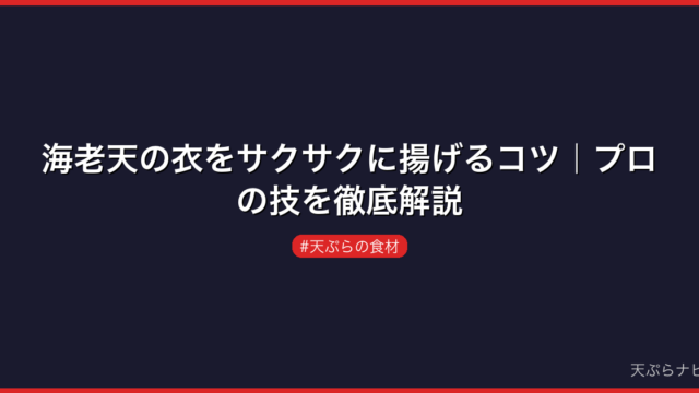 天ぷらの食材 海老天の衣をサクサクに揚げるコツ|プロの技を徹底解説 海老天の衣をサクサクに仕上げるコツを、下処理・衣の作り方・揚げ方の3ステップで徹底解説。プロの現場で実践される技術を家庭でも再現できるようわかりやすくお伝えします。 2026.03.17 天ぷらの食材