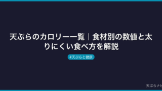 えびの天ぷら1尾は約53kcal、さつまいもの天ぷら1個は約114kcalと、同じ天ぷらでも食材によってカロリーは倍以上の差があります。「ダイエット中だから天ぷらは我慢しなければ」「揚げ物は全部NG」と思い込んでいませんか。実は、食材の選び方と食べ方を工夫すれば、天ぷらはダイエット中でも十分に楽しめるメニューです。この記事では、ダイエット中に天ぷらを食べるための7つのコツを、食材選びから食べ順、1日の献立プランまで具体的にお伝えします。まず天ぷらとダイエットの関係を整理し、次に実践的な食べ方のステップを解説、最後に専門店でのオーダー戦略までご紹介します。