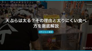 ただし、天ぷらが太りやすいとされる理由も理解しておく必要があります。天ぷらの衣は油を吸いやすい構造で、吸油率は15〜25%と揚げ物のなかでも高めです。加えて、天丼や天ぷらそばなど炭水化物と組み合わせる食べ方が多く、総カロリーが跳ね上がりやすい点も見逃せません。天ぷらが太る仕組みについては天ぷらが太る理由と対策の記事で詳しく解説しています。