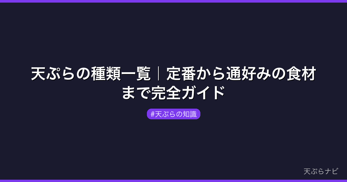 この記事では天ぷらの種類を食材ジャンル別に網羅的にまとめた。定番の魚介・野菜はもちろん、天ぷら専門店で出される通好みの食材、さらには地域による天ぷらスタイルの違いまで、天ぷらの全体像がわかる保存版ガイドだ。なお3月は、さわら・しらす・あさり・はまぐりなどの魚介と、菜の花・たけのこ(走り)といった野菜が旬を迎える時期である(気象庁 旬の食材データ、2026年3月時点)。