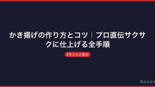 天ぷらの基本的な揚げ方のコツについては、「天ぷらの揚げ方のコツ」でさらに詳しく解説しています。また、海老天と並ぶ人気メニューであるかき揚げの作り方もぜひ参考にしてみてください。
