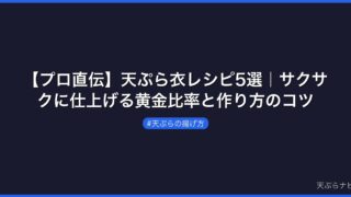 天ぷらの衣をサクサクに仕上げるコツについては「天ぷらの衣をサクサクにする方法|プロが教える3つのコツ」でさらに詳しく解説しています。また、食材ごとの揚げ時間については「天ぷらの揚げ方のコツ|初心者でもサクッと揚がる基本テクニック」もあわせてご覧ください。